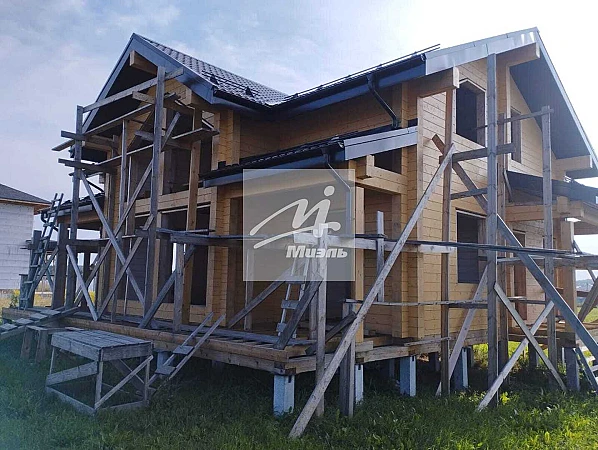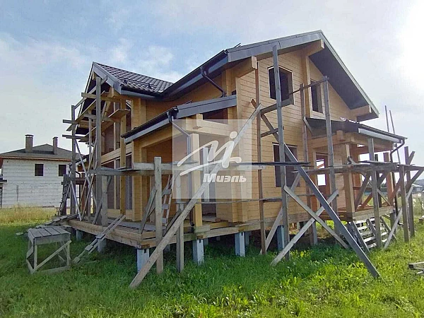 Материал стен дома-клееный брус камерной сушки 200×185 мм, северный лес Кировской области зимней заготовки. Фундамент-ж/б сваи 200×200×3000 мм. Отделка цоколя-ПВХ панели "под камень". Перекрытие-лаги 100×200 мм камерной сушки, " черновая доска" 25 мм, сетка от грызунов, утепление 200 мм, гидро-паро-изоляция. Крыша-металлочерепица "Монтеррей" 0.5 мм, цвет RAL 8017 (коричневый). Утепление кровли-минеральная вата Isover 200 мм, пароизоляционная плёнка. Карнизы-металлические софиты, цвет коричневый. Водосточная система-металлическая. Отделка стен-шлифовка, обработка грунтом, покраска антисептирующим составом Pinotex, цвета-серый (снаружи), белый (внутри). Обсадные коробки-доска, брусок камерной сушки. Окна и двери входные-ПВХ двухкамерный стеклопакет Rehau, внути цвет белый, снаружи-ламинация под 'дерево" коричневого цвета. Наличники-деревянные. Водопровод-скважина, водопровод подведен и будет разведён по дому. Электричество- стиль "ретро" (открытые, витые провода), будут установлены розетки выключатели, внутренние и уличные светильники. Канализация-септик. Отопление-котел электрический, панельные радиаторы отопления, внутрипольные конвекторы возле панорамных окон. Двери межкомнатные-МДФ, потолки-имитация бруса, полы-ламинат. Санитарно-технические приборы-душевая кабина, унитаз, раковина. Площадь террасы 35.4 м2.
