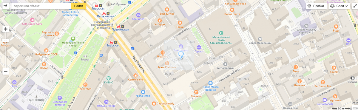 - Рядом: Московский театр мюзикла, Московский государственный театр, Московский музей современного искусства. Парковые пешие зоны: Пушкинский сквер, сад Эрмитаж, Тверской бульвар.