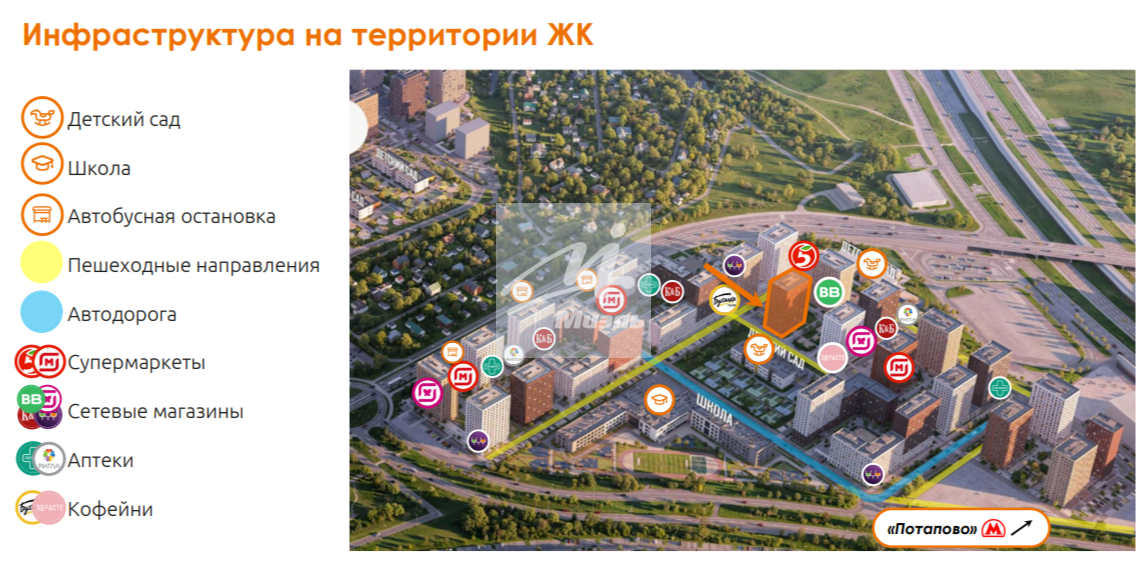 - Сквозной пешеходный бульвар от края до края ЖК, с лавочками, озеленением, отдельной велодорожкой и прогулочной зоной;
