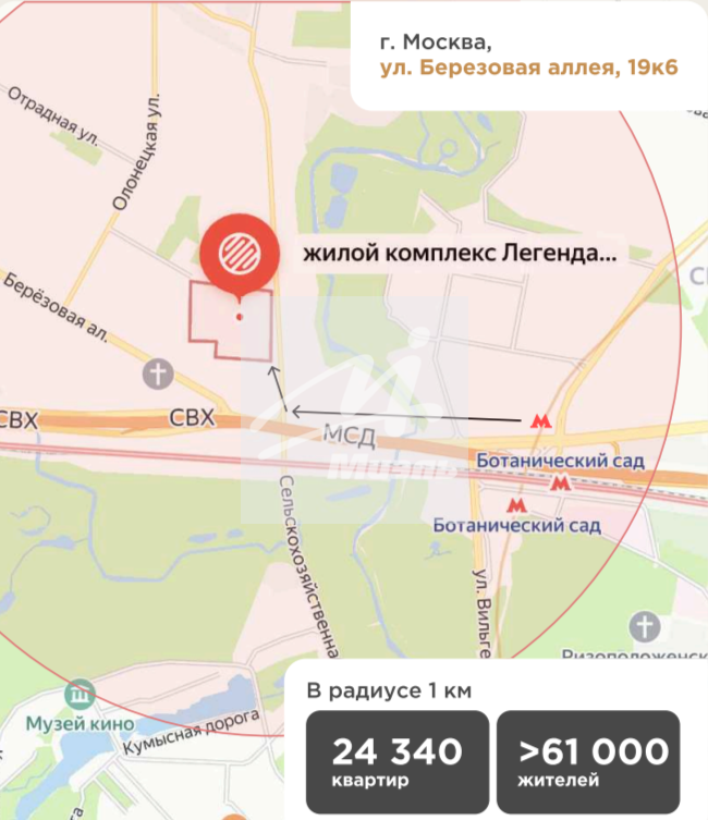 - В радиусе 1 км - 24 340 квартир >61 000 жителей