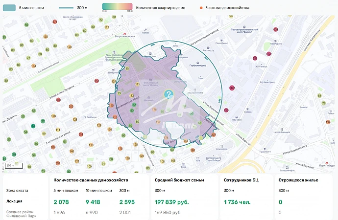 - Высокая плотность населения – 6 849 домохозяйств Средняя плотность – 5 338 домохозяйств (район Филёвский Парк).