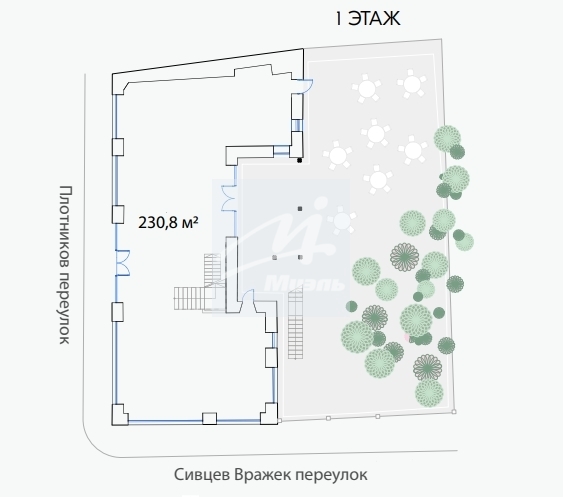 - К зданию прилегает земельный участок, который может эксплуатироваться по усмотрению владельца: уютный закрытый двор для мероприятий, веранда ресторана, автомобильная парковка и др.