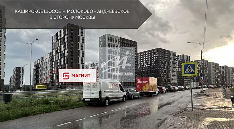 - Трасса Каширское шоссе – Молоково – Андреевское является единственным в настоящий момент выездом в Москву для жителей близлежащих населенных пунктов Ленинского района Московской области. Четырехполосная трасса примыкает к торцу дома, со стороны основного въезда в квартал помещение также отлично просматривается.