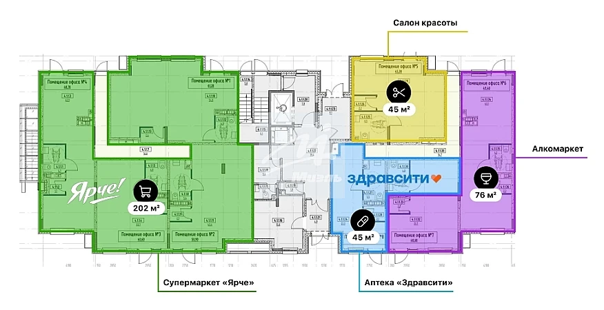 - Потенциальные арендаторы: Супермаркет Ярче, Аптека Здравстити, Алкомаркет, Салон красоты.