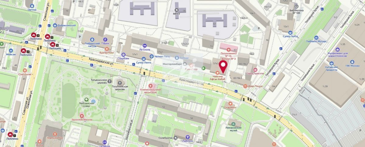 - Объект расположен в пяти минутах ходьбы от ст.м. «Люблино», на первой фасадной линии Краснодарской улицы.