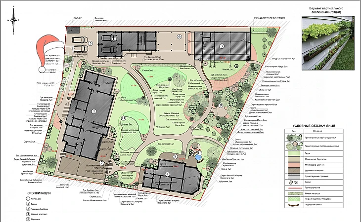 • Правильная форма участка (31 сотка) позволила разместить гостевой дом, павильон-барбекю и баню, сохранив просторный внутренний двор.