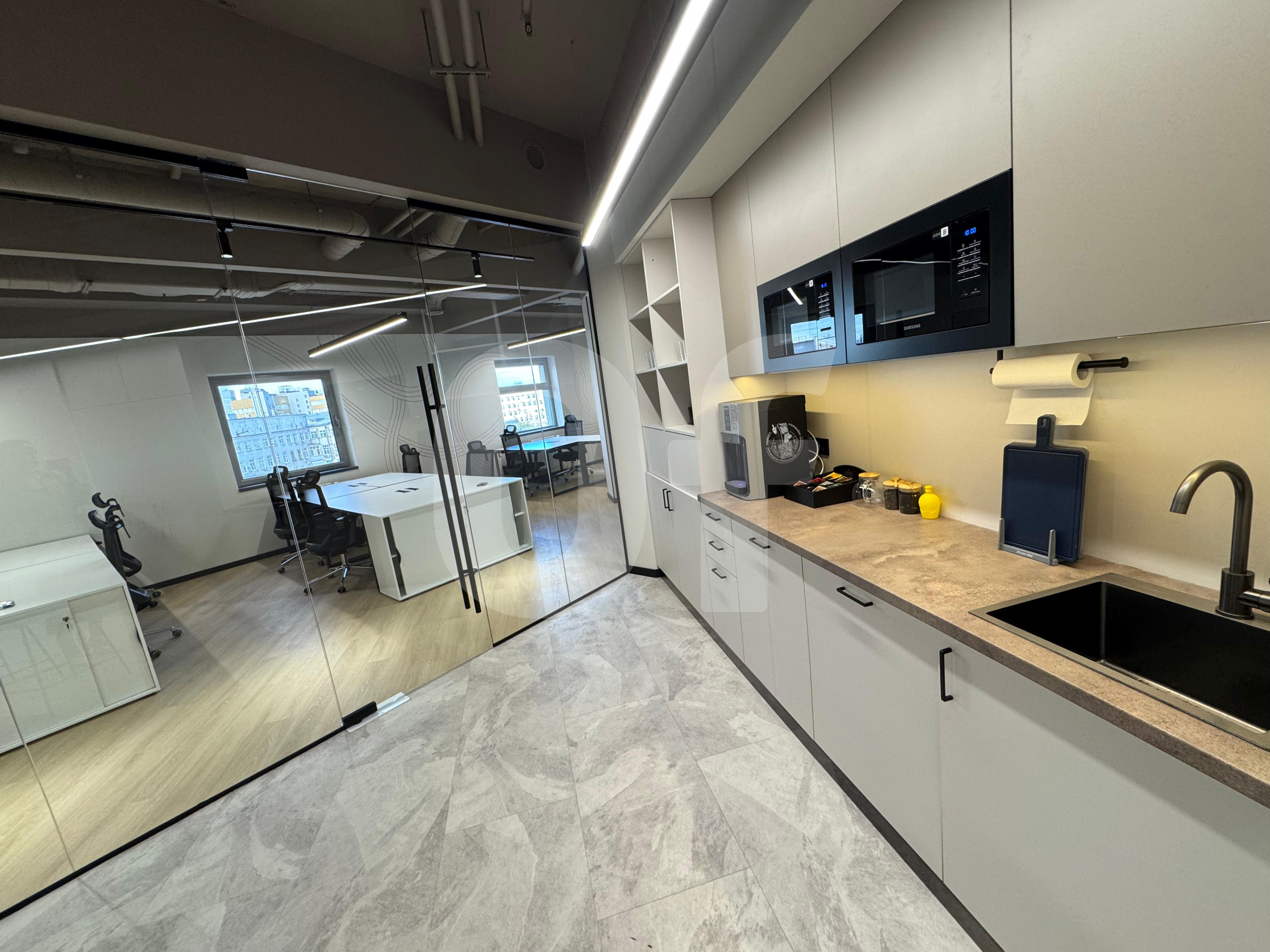 Половина этажа, панорамные окна, переговорные комнаты, собственные санузлы, оборудованная кухня.