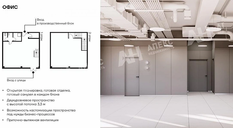 Помещения в здании А состоят из универсального промышленно-складского блока и двухэтажной офисной части с возможностью организации шоу-рума. У каждого помещения предусмотрен собственный отдельный вход.