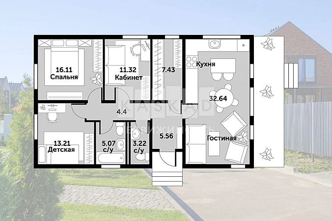 Планировка: 2 спальни, кабинет, гардеробная комната, 2 с/у, просторная кухня-гостиная;