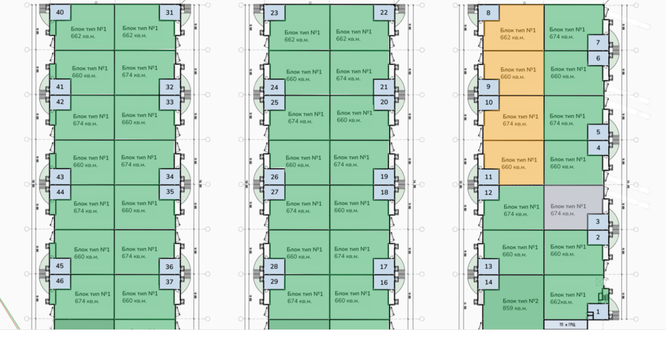 *Блоки от 417м2 несколько юнитов можно объединить в единое пространство и увеличить площадь
