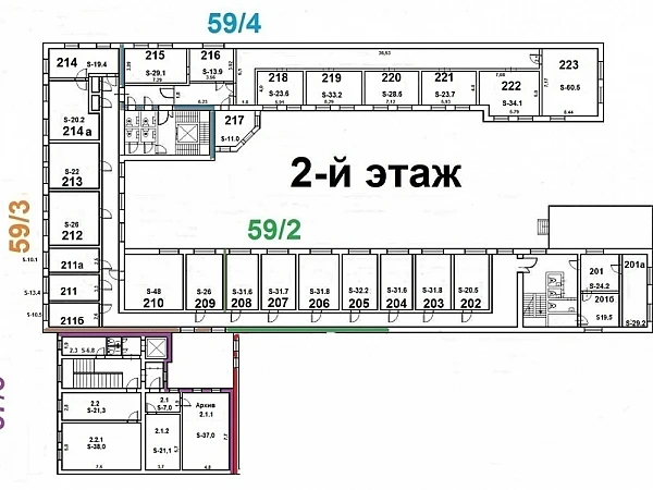 . Здания: ул. Лесная д.59с2 (2039,2м2), д.59с3 (1561,4м2), д.59с4 (1145,6м2), д.57с5 (924м2). Объединены между собой и имеют переход внутри комплекса.