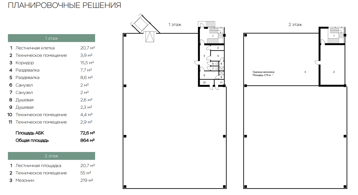 Здание спроектировано с учетом характеристик, обеспечивающих его высокую ликвидность и привлекательность для арендаторов. Площадь распределена следующим образом: первый этаж — 986.48 м2, антресоль — 363.83 м2. Сооружение разделено на два автономных блока. Высота потолков на первом этаже составляет 10 метров до несущих конструкций и 5 метров до уровня антресоли, высота пола антресоли — 5.75 метра.