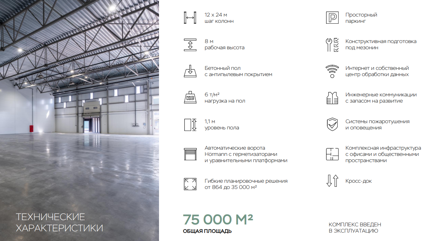 Каждый блок оснащен не менее чем двумя разгрузочными воротами. Разгрузочная зона приподнята на 1.2 метра от уровня земли и укомплектована двумя доклевеллерами на модуль. Предусмотрена электрическая мощность 150 кВт и централизованное водоснабжение. Полы выполнены из бетона с антипылевым покрытием, обладают высокой прочностью и рассчитаны на нагрузку до 5 тонн на квадратный метр. Рабочее пространство первого этажа свободно от колонн, которые расположены по периметру и под антресолью.