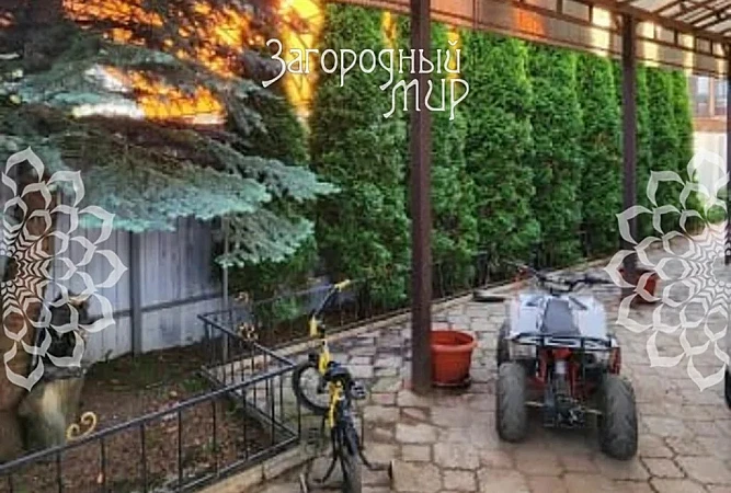 Участок 7.5 соток: Тёплый гараж, большой двор оборудованный прозрачным навесом с откатными воротами и парковкой на несколько автомобилей, зона барбекю, выполнены ландшафтные работы, посажены молодые лесные и фруктовые деревья, много цветов, туи и ели. Участок огорожен забором. ИЖС.