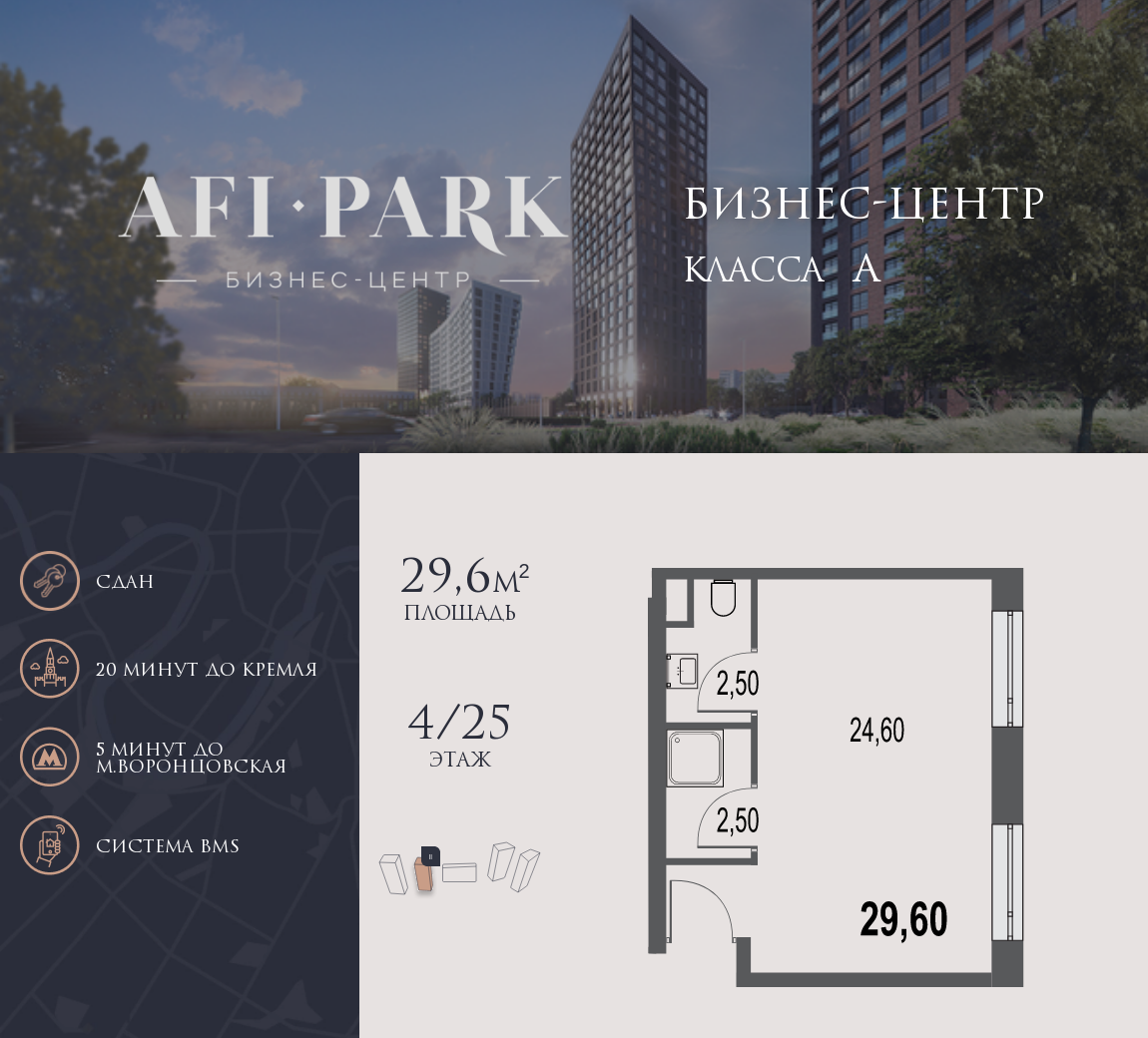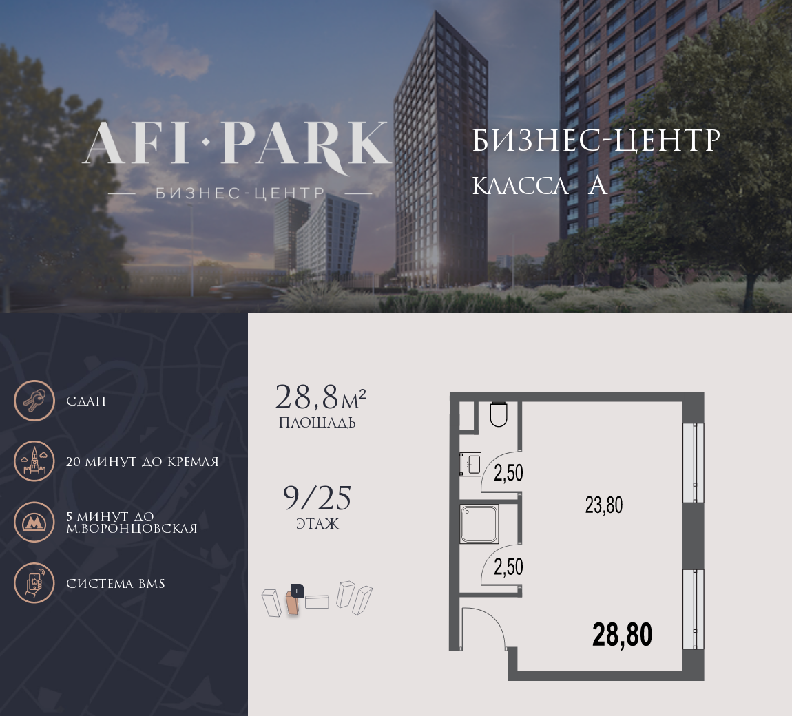 . Офис площадью 27.2 м2 расположен на 8 этаже МФК, без отделки, потолки 3,30 м.