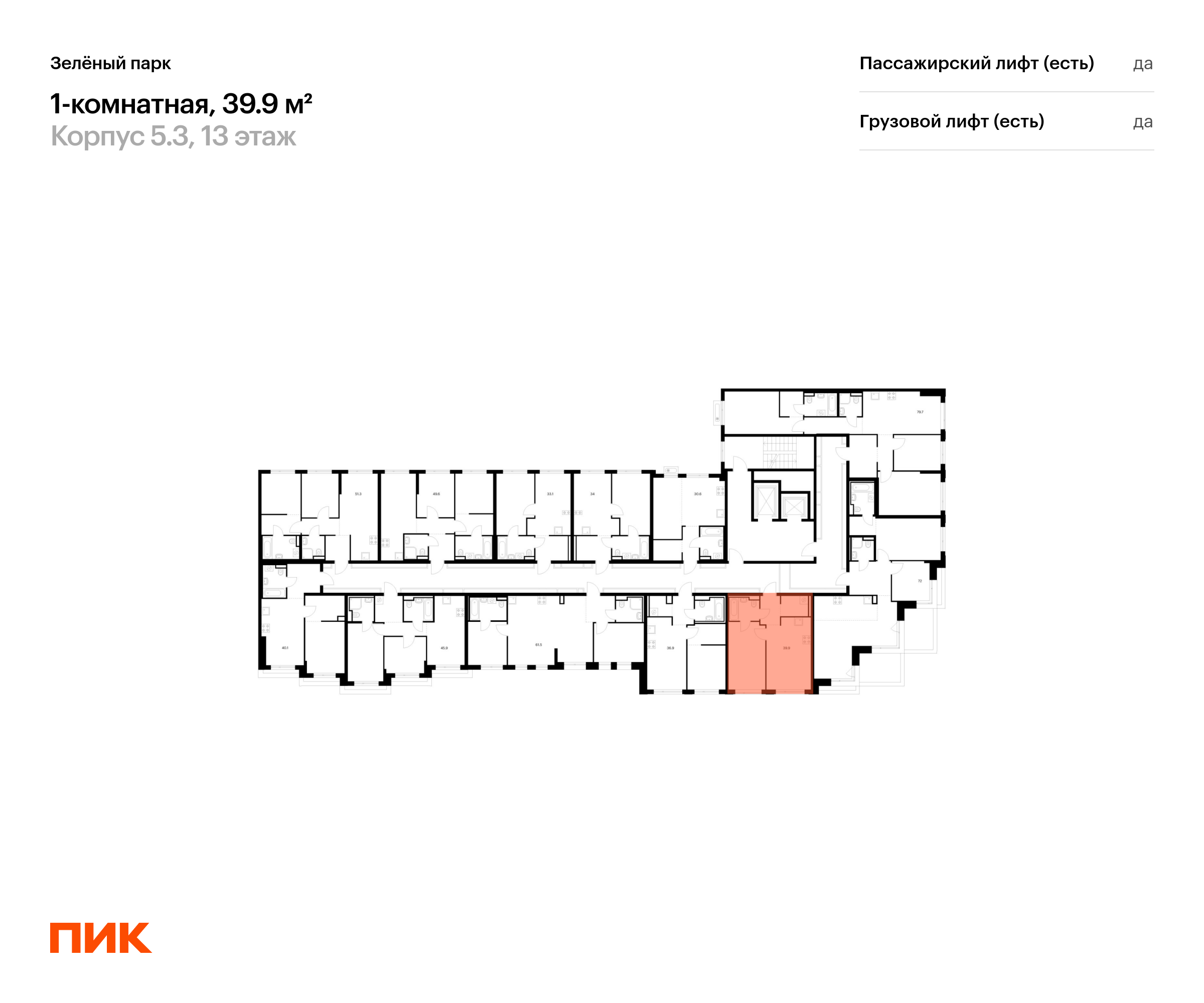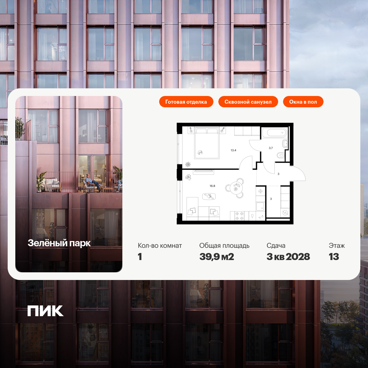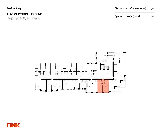 Продаётся 1-комн.квартира площадью 39.90 кв.м на 13 этаже 13 этажного дома (Корпус 5.3, секция 3) проекта ПИК Зелёный парк. Светлый просторный подъезд на уровне земли, функциональная планировка, большие окна, с отделкой.