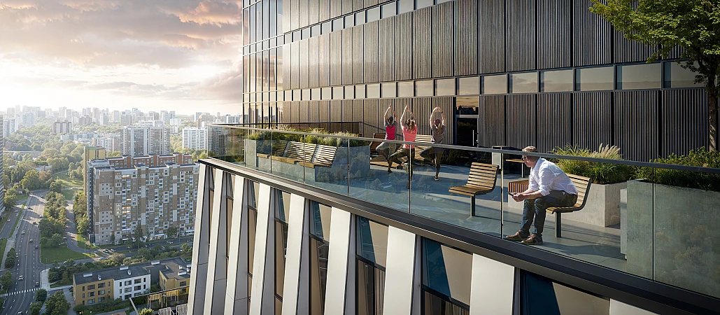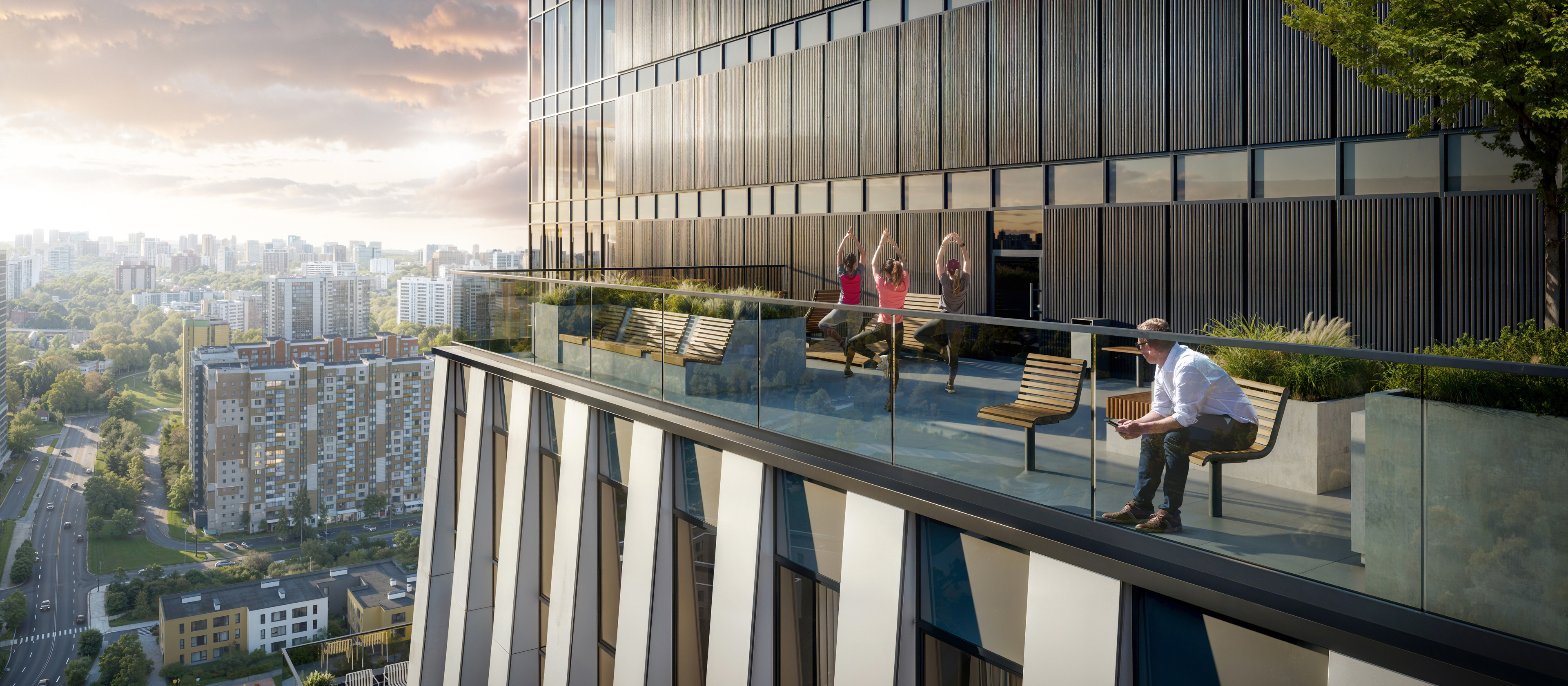 В корпусе 1.4 появится общественная терраса на 30-м этаже. Доступ сюда есть только у жителей, поэтому вы не встретите в этом пространстве посторонних людей. Здесь можно заниматься спортом, отдохнуть за чтением книги или создать собственный сад. А ещё отсюда открываются красивые виды на город.