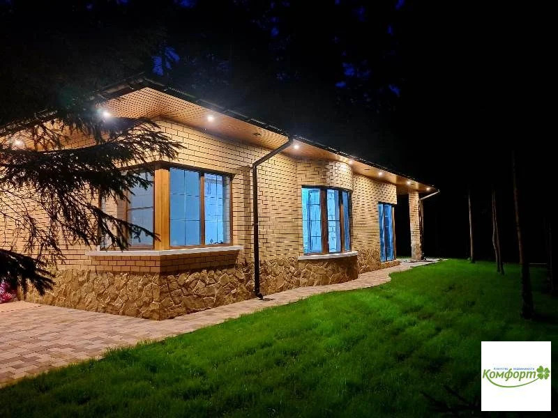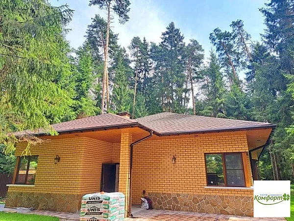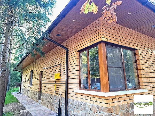 Дом 164 кв.м., пеноблок, облицовка кирпич, одноэтажный, предчистовая отделка, в доме установлены панорамные пластиковые окна, разводка отопления, мягкая кровля, ливневка, дренаж.