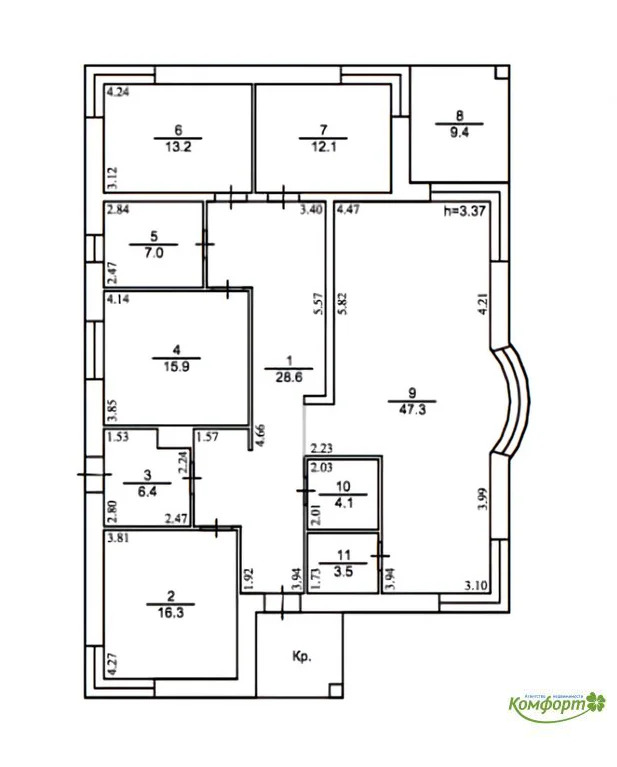 ПЛАНИРОВКА (смотрите раздел фото): четыре комнаты (12.1/13.2/15.9/16.3) кв.м., кухня+столовая+зал- 47.3 кв.м., высота потолка 3,4м., два санузла, кладовка, техническая комната.