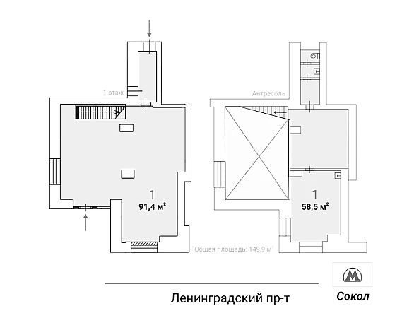 Общая площадь: 149.9 м2 (1 этаж- 91,4 м2; антресоль- 58.5 м2)