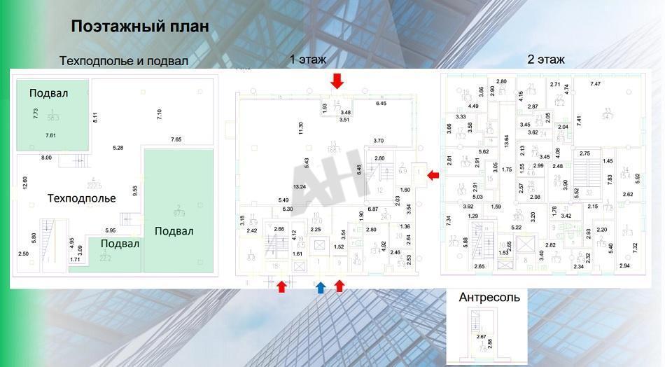 Площадь здания распределена следующим образом: первый этаж составляет 274,4 кв.м., второй этаж — 450,3 кв.м., также в составе объекта имеются подвал и техническое подполье общей площадью 400,9 кв.м. Земельный участок площадью 840 кв.м. передается в аренду. Разрешенный вид использования объекта — бытовое обслуживание, что также позволяет разместить объекты торговли, общественного питания и сферы услуг.