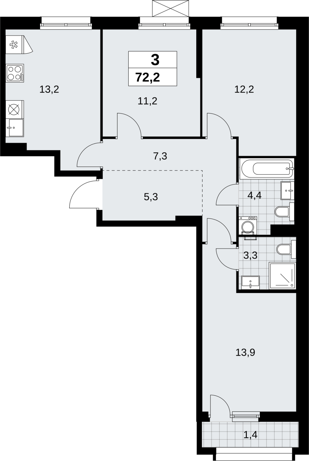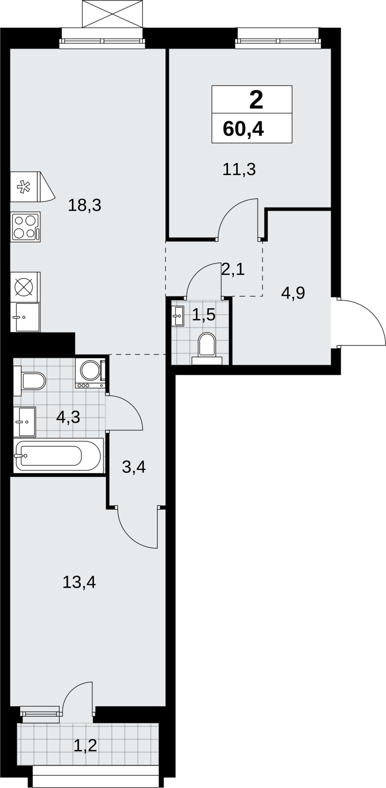 Общая площадь квартиры 80, 1 кв. м. , жилая - 48, 9 кв.м., кухня - 11,8 кв.м. Санузел раздельный. Квартира без отделки, что позволяет сделать ремонт на свой вкус.