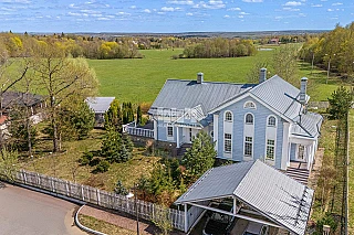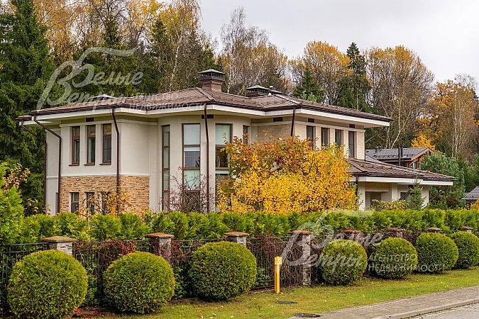 Меблированный дом в современном классическом стиле с элементами английской архитектуры и большими окнами. В комфортной планировке большие светлые комнаты и санузлы, четыре спальни (одна на первом этаже), камин в гостиной с мраморной отделкой и изящная радиусная лестница с мраморными ступенями и коваными перилами. В мастер-спальне второй камин с мраморным декором и джакузи с гидромассажем в ванной комнате. Интерьер дополнен дубовым паркетом, импортными отделочными материалами и дизайнерской мебелью. Участок у леса оформлен в стиле английского сада, есть беседка с мангалом, каркасный бассейн с подогревом, уютные зоны отдыха. Участок расположен в приватной зоне строго охраняемого коттеджного посёлка премиум-класса со своим озером и бульваром в 10 минутах езды от городской инфраструктуры.