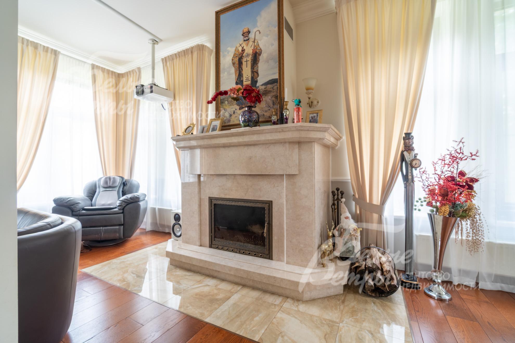 Внутренняя отделка: классический интерьер дома, выполненный преимущественно в светло-бежевой гамме, сочетает высококачественные импортные материалы и дорогостоящие натуральные покрытия: мрамор нескольких сортов, паркет из массива дуба. На стенах – декоративная штукатурка и обои, на полу – керамогранит и паркет, потолки из гипсокартона. Гостиную украшает дровяной камин, отделанный мрамором. Второй камин располагается в мастер-спальне, он также отделан мрамором. На второй этаж ведёт железобетонная радиусная лестница со ступенями и подступенками из итальянского мрамора и перилами художественной ковки. Установлены межкомнатные итальянские двери высотой 2,1 м, в том числе со стеклянными вставками, подоконники из итальянского мрамора и искусственного камня, кондиционеры Toshiba (во всех комнатах). На первом этаже и во всех санузлах – водяной подогрев полов.