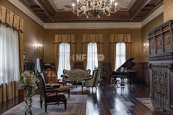 Фрески, росписи, холсты маслом в интерьере на стенах и потолках выполнены преподавателями Строгановки по канонам викторианской эпохи.