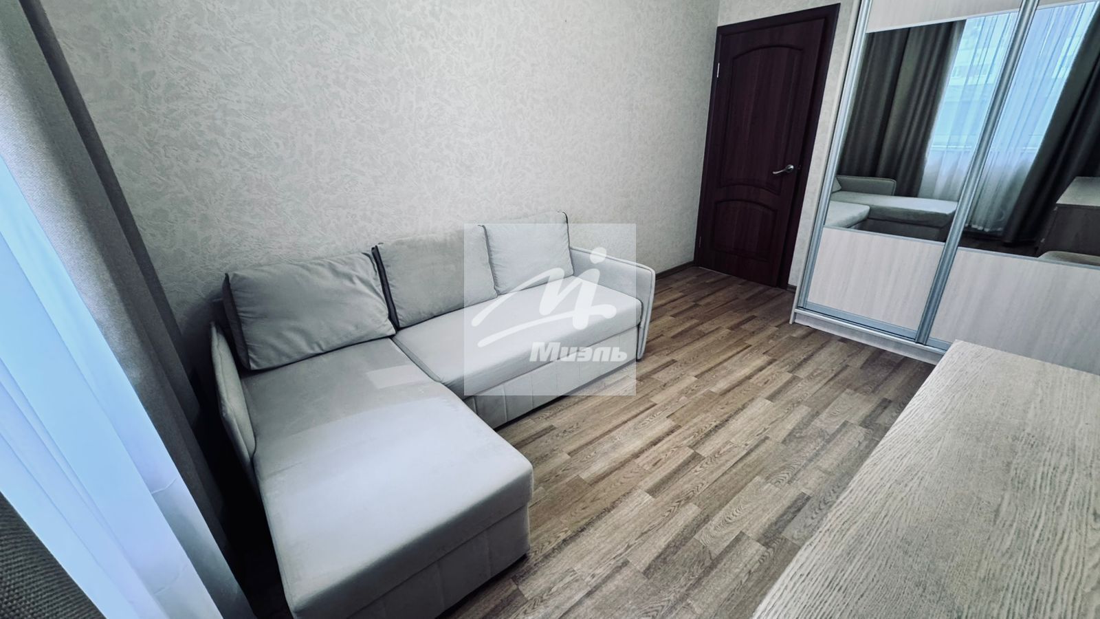 В гостиной есть большой угловой диван, шкаф-купе, комод, телевизор, светильник, стол, стул.