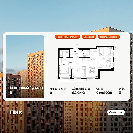 Купить 2к квартиру 63 м² в ЖК Кавказский бульвар 51