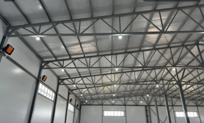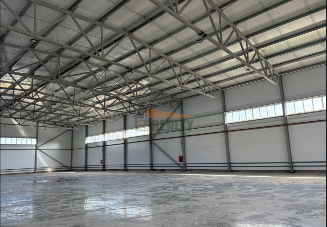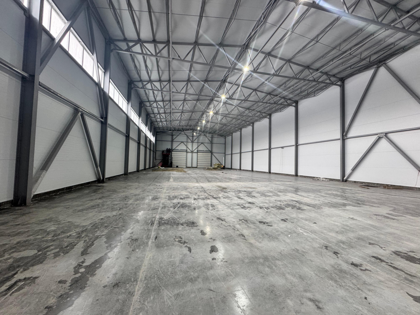 Высота потолков 9 м, в коньке 13,8 м, полы бетон антипыль, 2 ворот в ноль!