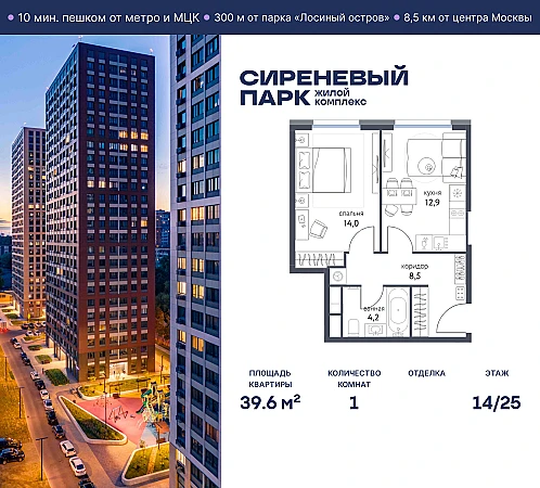 Купить 1к квартиру 39 м² в ЖК Сиреневый парк