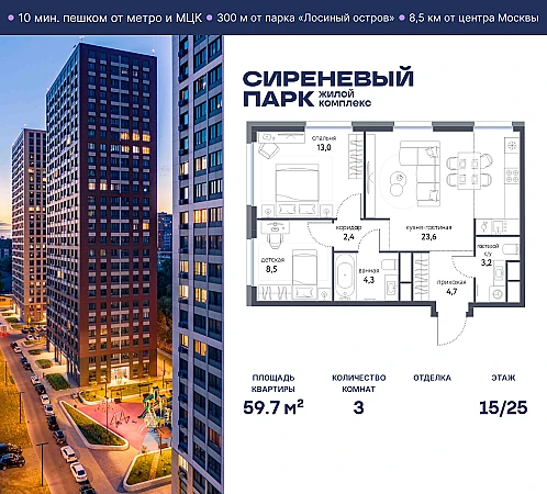 Купить 3к квартиру 59 м² в ЖК Сиреневый парк