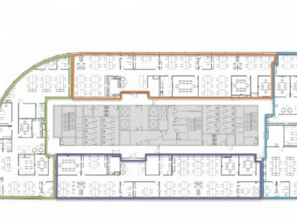 . Офис 656м2 находится на 4 этаже (на плане выделен оранжевым). Остекление от пола до потолка. Помещение сдается с высококачественной отделкой.