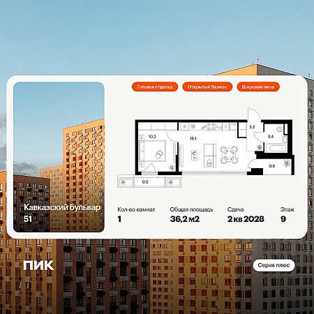 Продаётся 1-комн.квартира площадью 36.20 кв.м на 9 этаже 23 этажного дома (Корпус 3.1, секция 1) проекта ПИК Кавказский бульвар 51. Светлый просторный подъезд на уровне земли, функциональная планировка, большие окна, с отделкой.