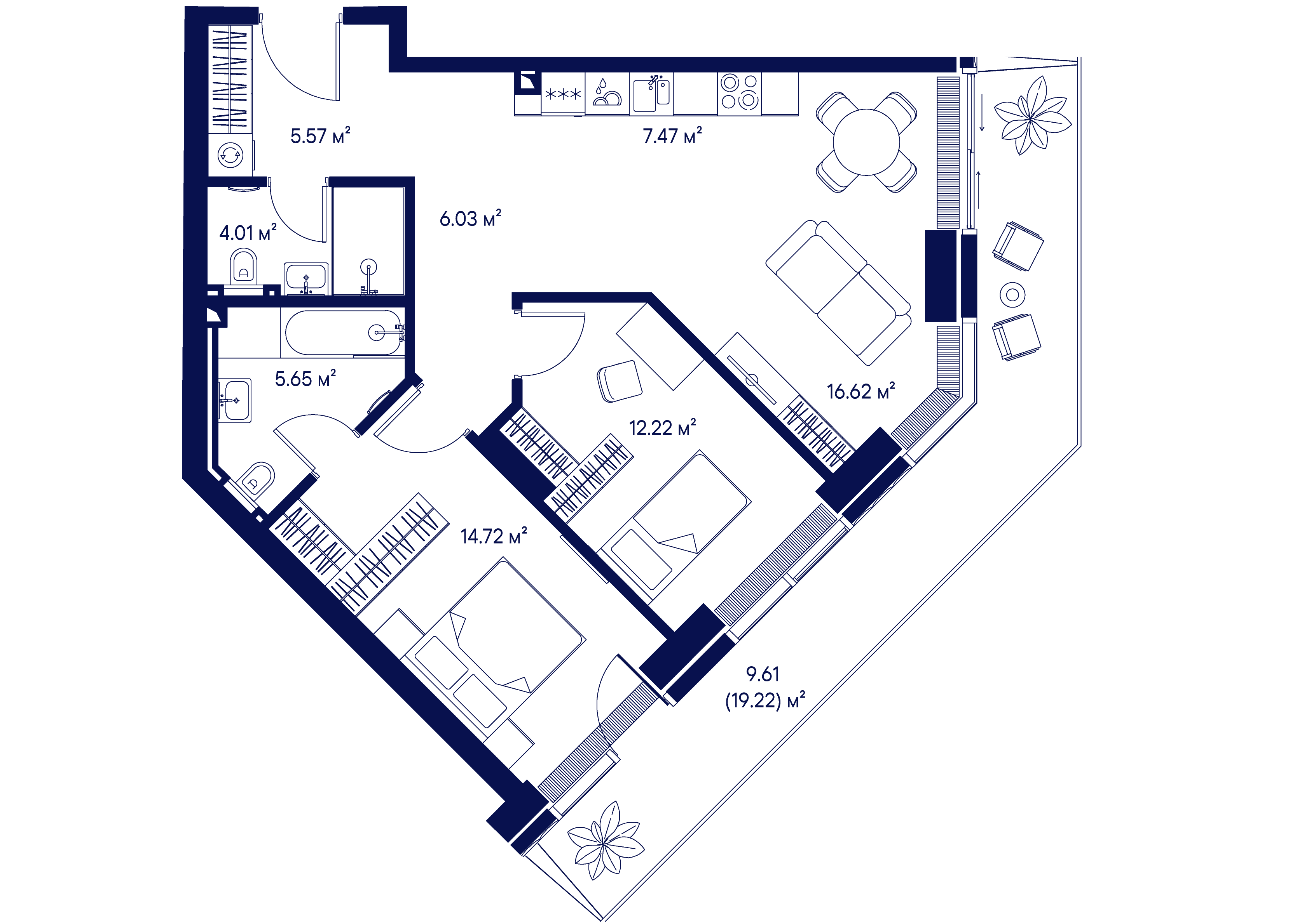 • функциональная планировка: большая кухня-столовая, три изолированные комнаты, два санузла