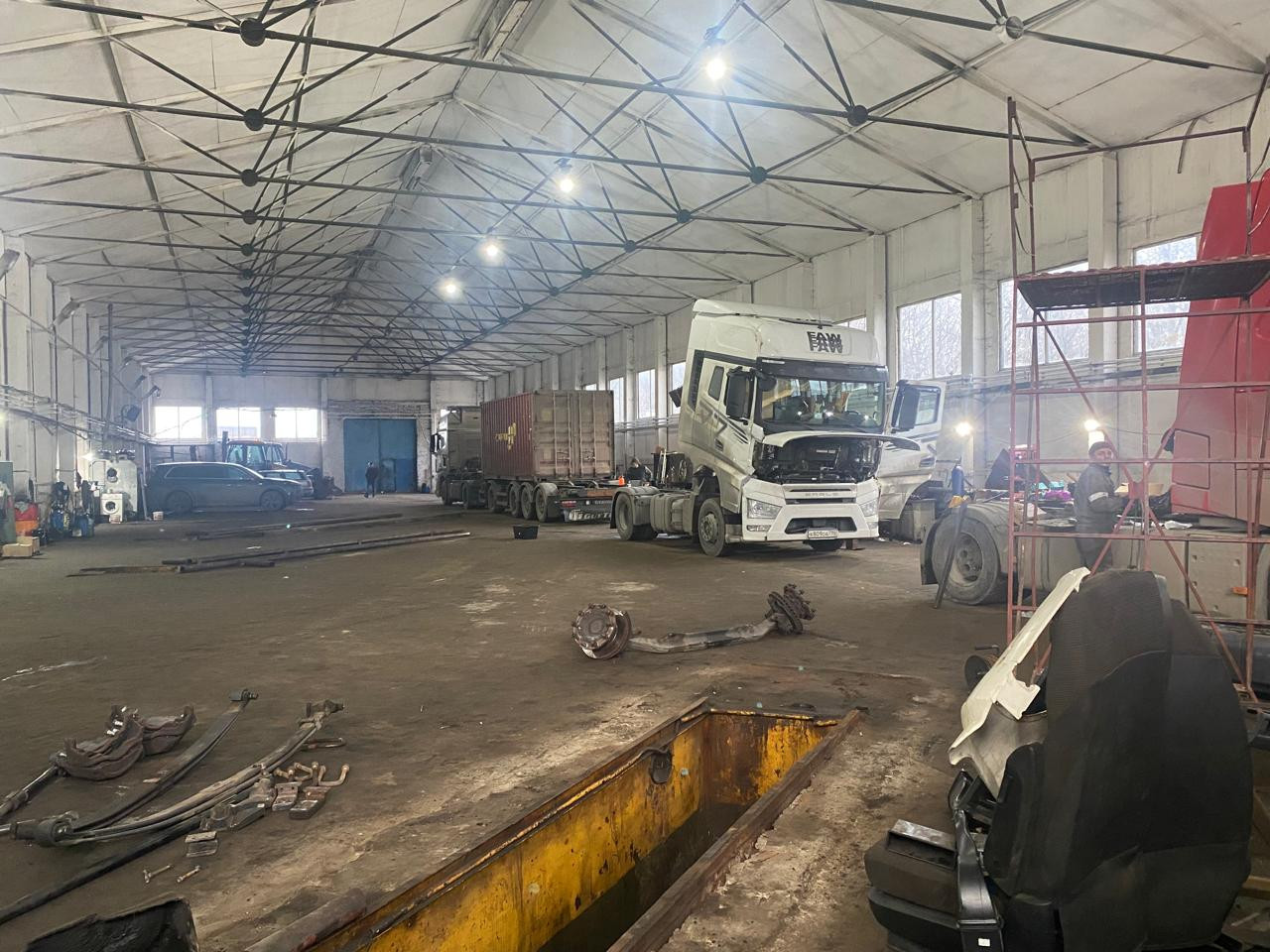 Также имеются три ремонтные ямы, помещение с кран-балкой, подъемник.