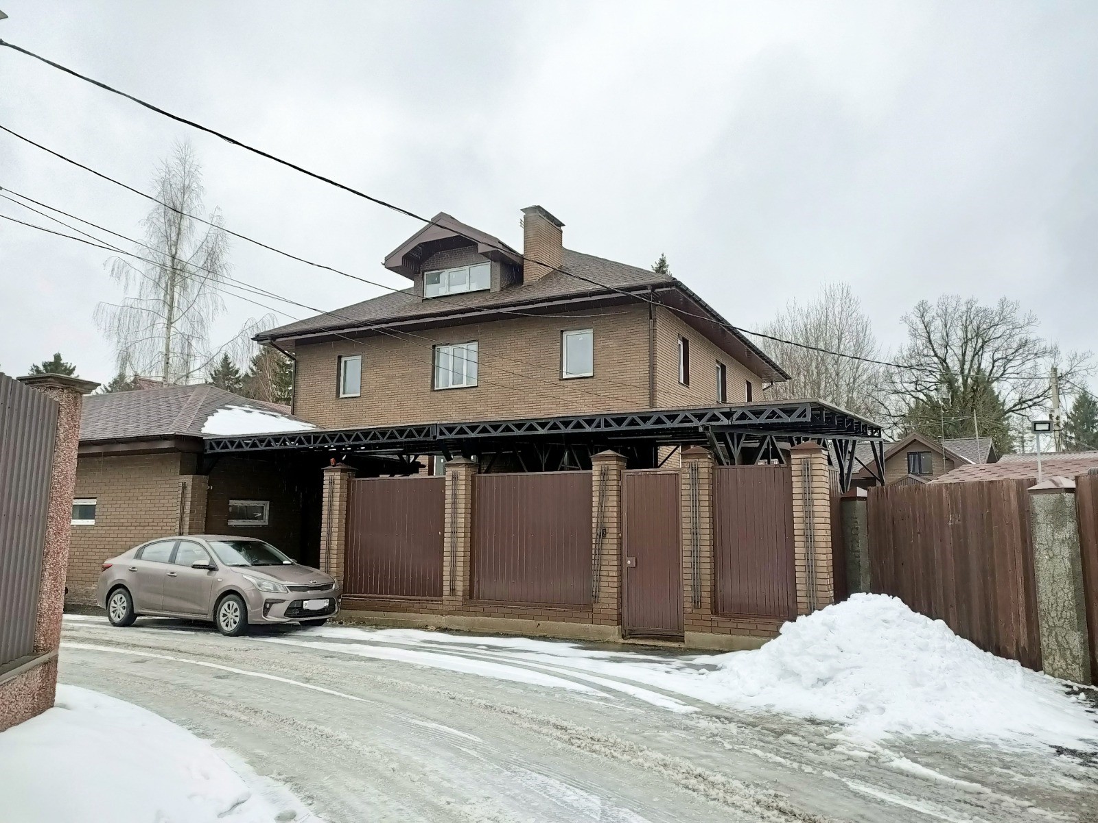 Навес на 5 машин, по периметру участок огорожен забором, на въезде автоматические откатные ворота.