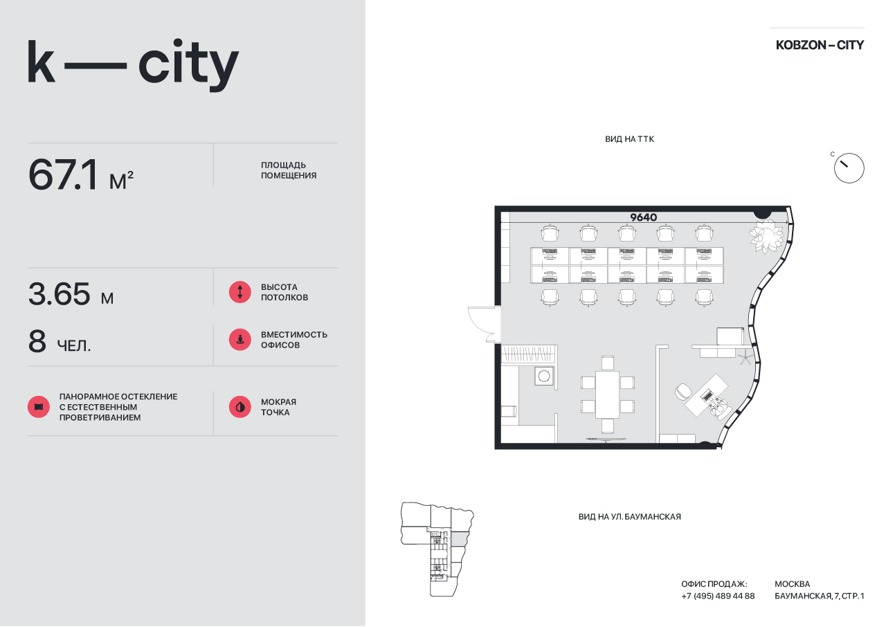 Офис 67 м2 в новом БЦ класса А K-CITY на Бауманской от Застройщика. Оптимальный компактный вариант для размещения на 5-7 человек. В 5 мин. пешком от м. "Бауманская", в 1 мин. от ТТК!