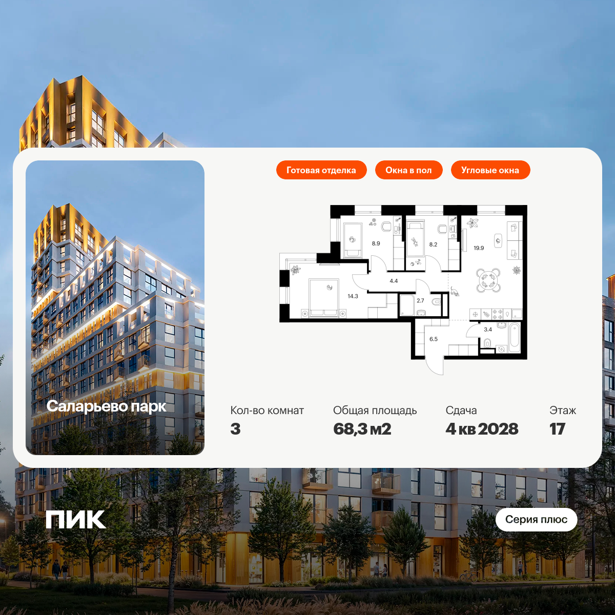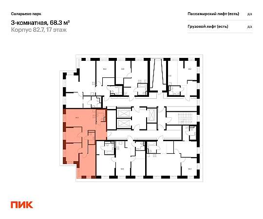 Продаётся 3-комн.квартира площадью 68.30 кв.м на 17 этаже 24 этажного дома (Корпус 82.7, секция 7) проекта ПИК Саларьево парк. Светлый просторный подъезд на уровне земли, функциональная планировка, большие окна, с отделкой.