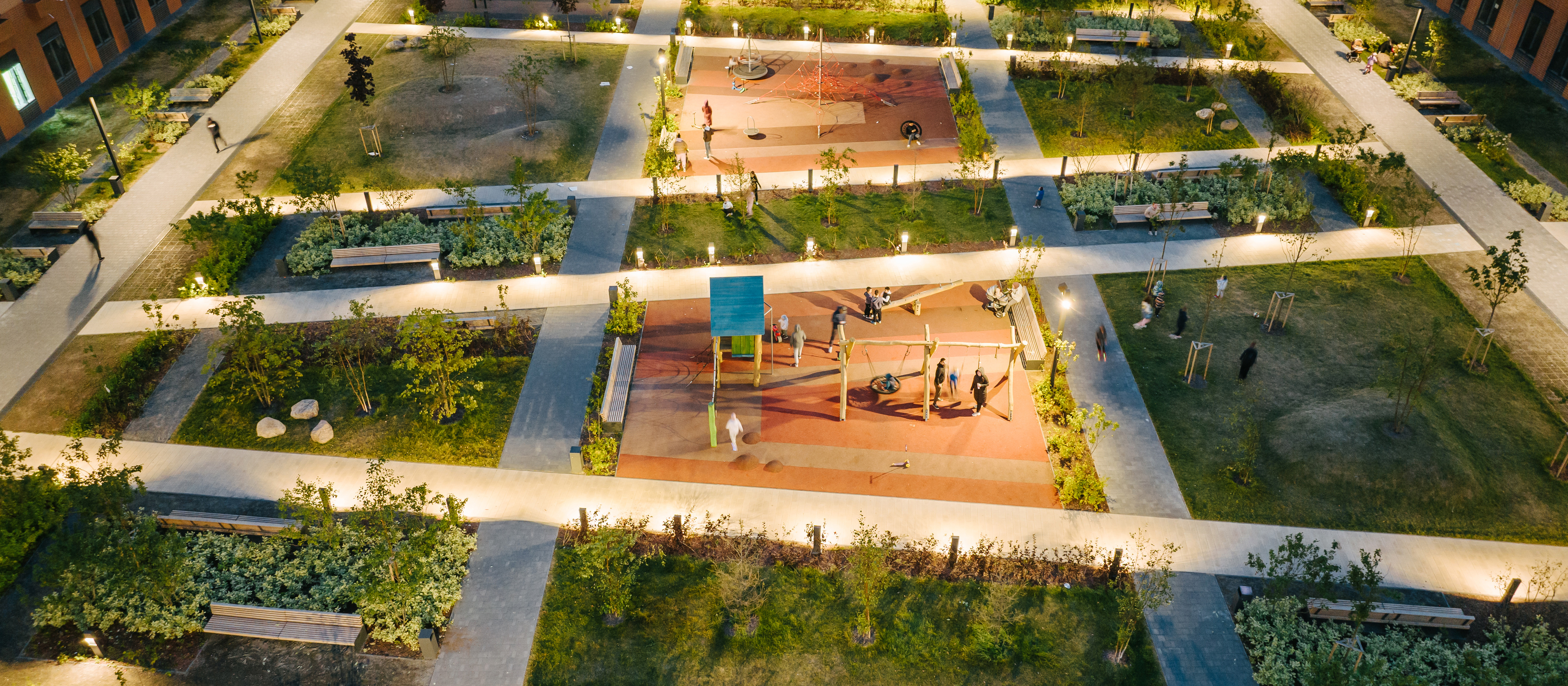Во дворах — зелёные парки с местами отдыха, детскими и спортивными площадками. На первых этажах домов работают магазины, кафе и полезные сервисы. А для владельцев автомобилей предусмотрены многоуровневый и подземный паркинги.