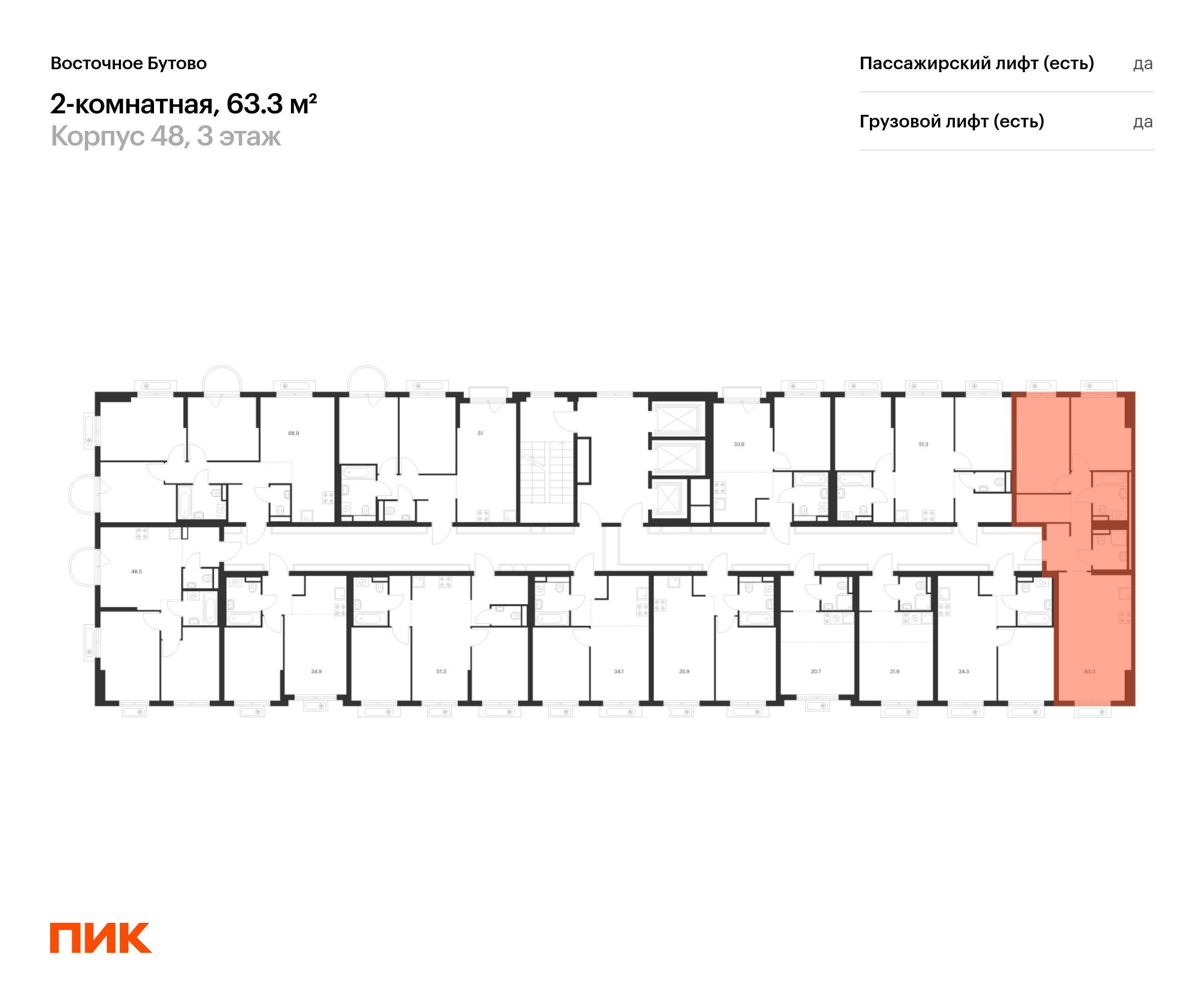 Продаётся 2-комн.квартира площадью 63.30 кв.м на 3 этаже 25 этажного дома (Корпус 48, секция 4) проекта ПИК Восточное Бутово. Светлый просторный подъезд на уровне земли, функциональная планировка, большие окна, с отделкой.