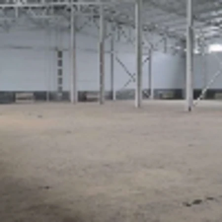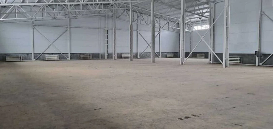 Высота потолка: 11 м до конька, 8 м до балок. Полы с антипылевым покрытием. Двое ворот в ноль. Высота ворот 4 м, ширина 4,2 м.
