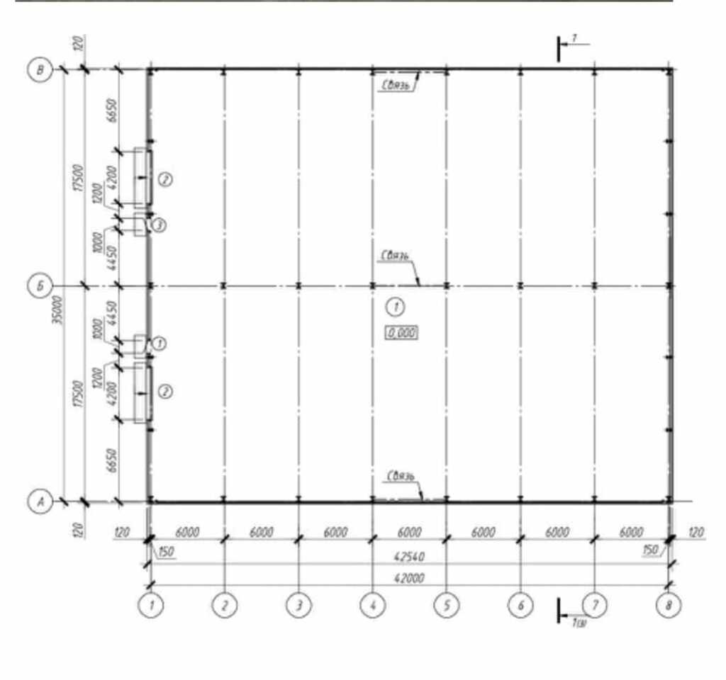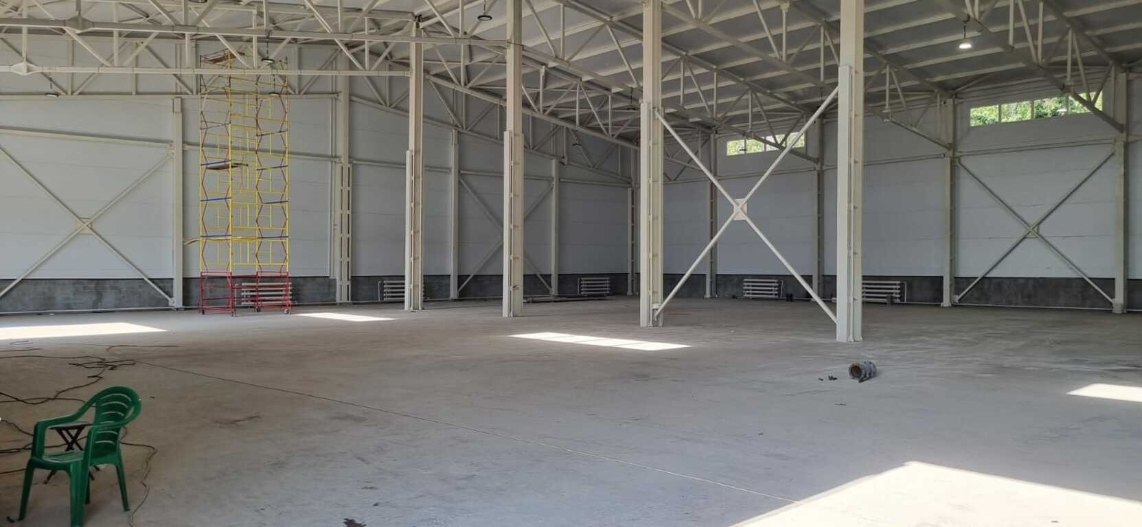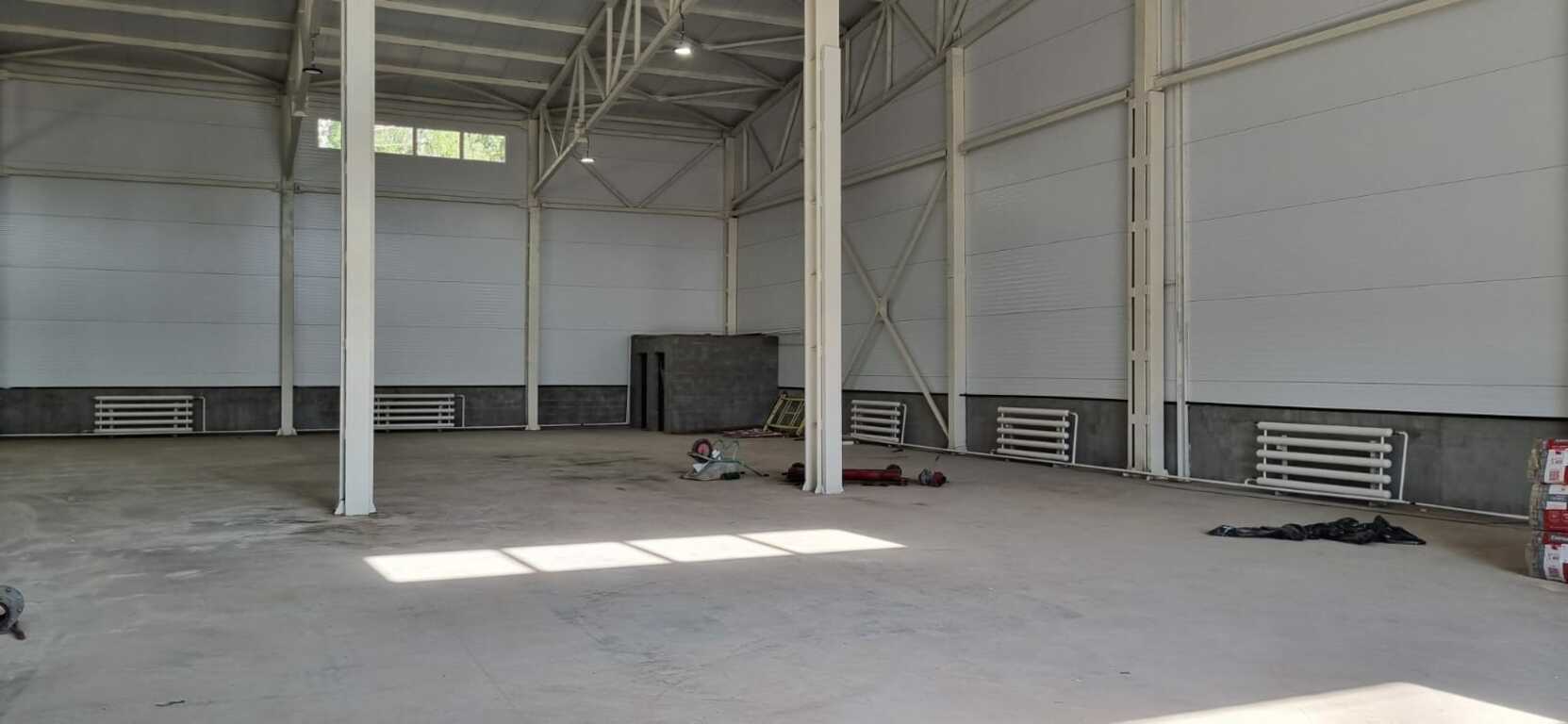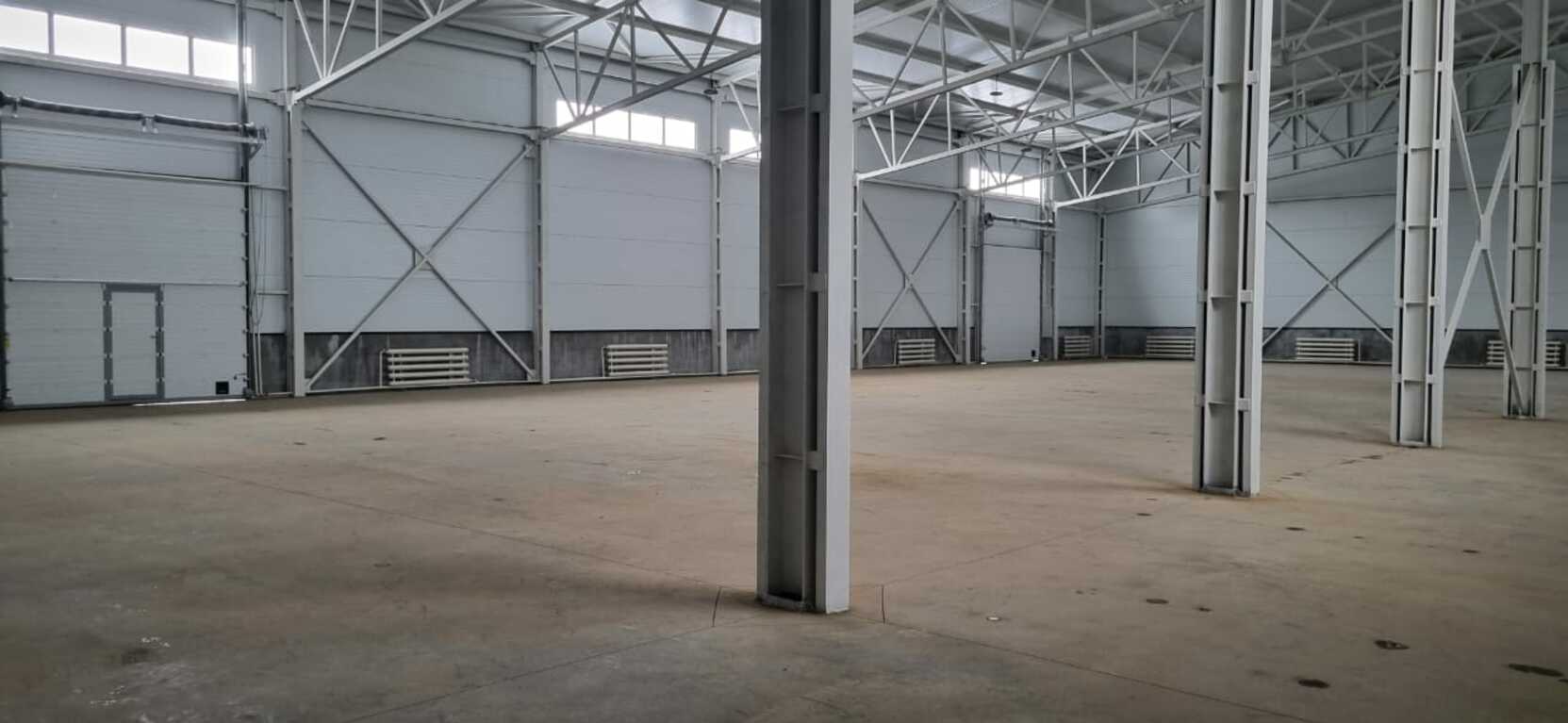 Высота потолка: 11 м до конька, 8 м до балок. Полы с антипылевым покрытием. Двое ворот в ноль в каждом строении. Высота ворот 4 м, ширина 4,2 м.