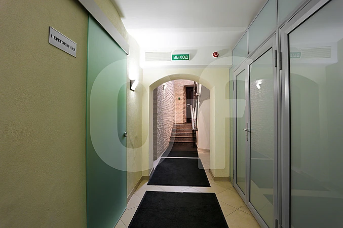 Особняк включает около 40 офисных помещений площадью от 8 до 70 м² с качественной отделкой: керамогранит в зонах общего пользования, паркет/ковролин в кабинетах, гипсокартонные перегородки и алюминиевые двери с матовым стеклом. Каждый кабинет оборудован телефонной и интернет-разводкой, функционирует серверная комната.