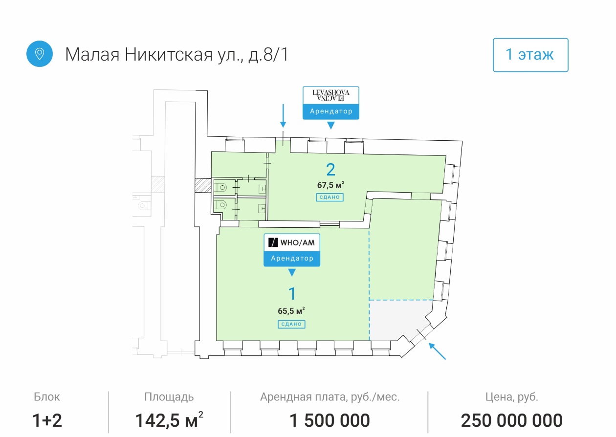Арендная плата 2 100 000 рублей в месяц, коммунальные платежи и электричество оплачиваются арендатором отдельно. Схема сделки: договор купли-продажи недвижимости (ДКПН).
