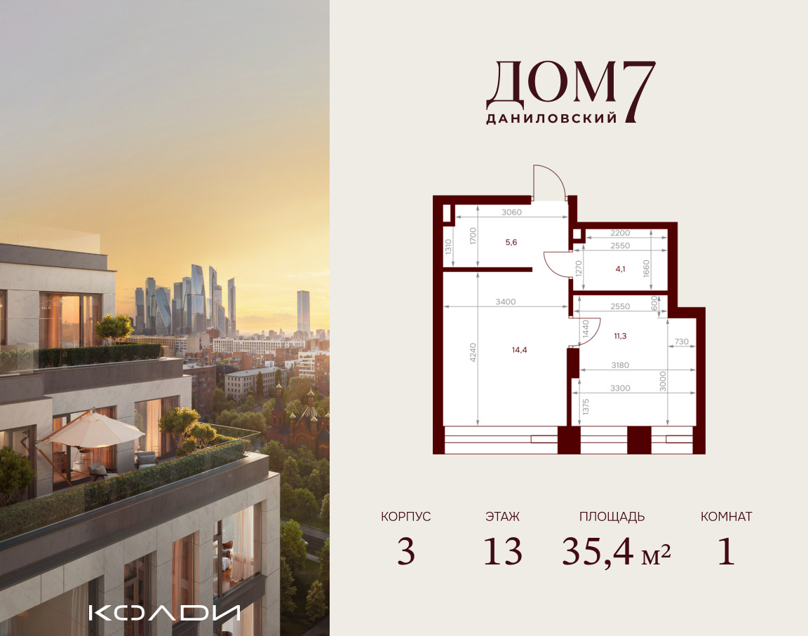 Продается 1-к квартира общей площадью 35.40 кв.м на 13 этаже в жилом квартале премиум-класса "Дом 7 Даниловский".