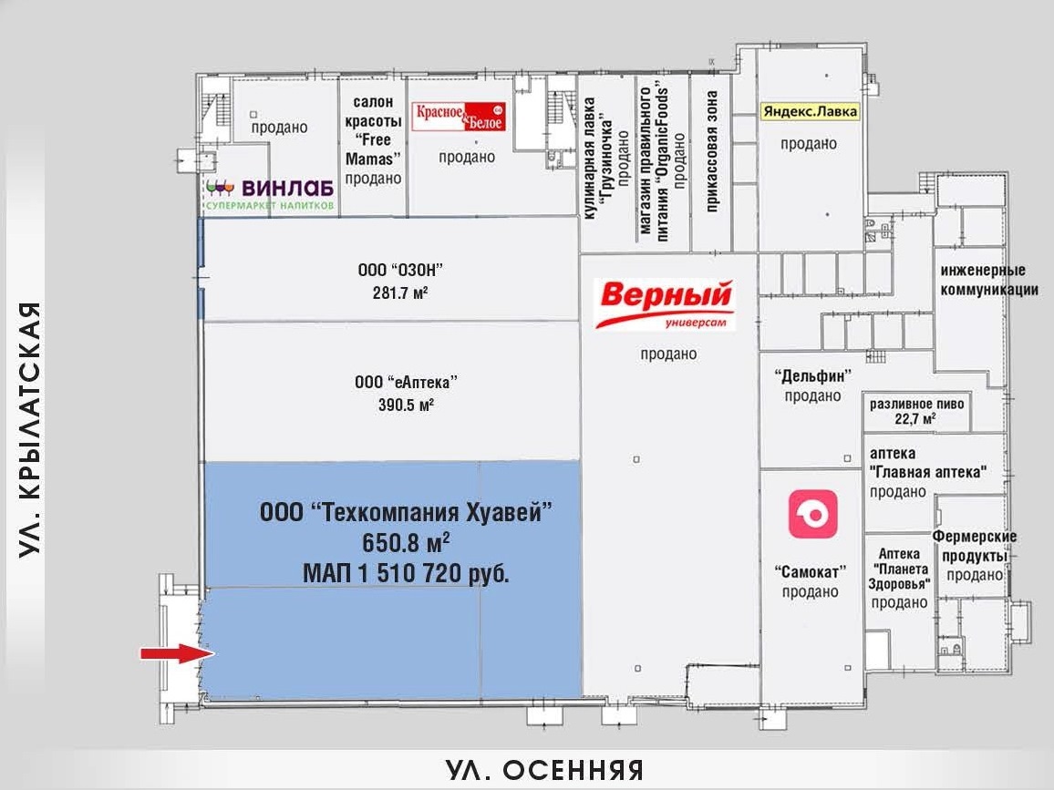 Номер лота на нашем сайте: 38194. Представляем Вашему вниманию новый объект - помещение с Арендатором HUAWEI, месячный арендный платеж составляет 1 510 720 руб., договор аренды заключен на 5 лет с ежегодной 5% индексацией. в торговом комплексе на ул. Крылатская, д.33, к.3. Помещение площадью - 650,8 кв.м, расположено на 1 этаже торгового комплекса, блок имеет два входа с улицы, остекление по периметру фасада, потолки высотой 7 м. В помещении выполнен высококачественный ремонт. Коммуникации центральные. Арендатор - структурное подразделение технокомпании HUAWEI по организации питания сотрудников компании. Помещение является административной зоной штаб-квартиры и используется только для сотрудников компании! Магазина продаж нет! Основной офис компании HUAWEI расположен в БЦ "Krylatsky Hills". Ставка аренды при смене налогового режима Арендодателя не меняется.