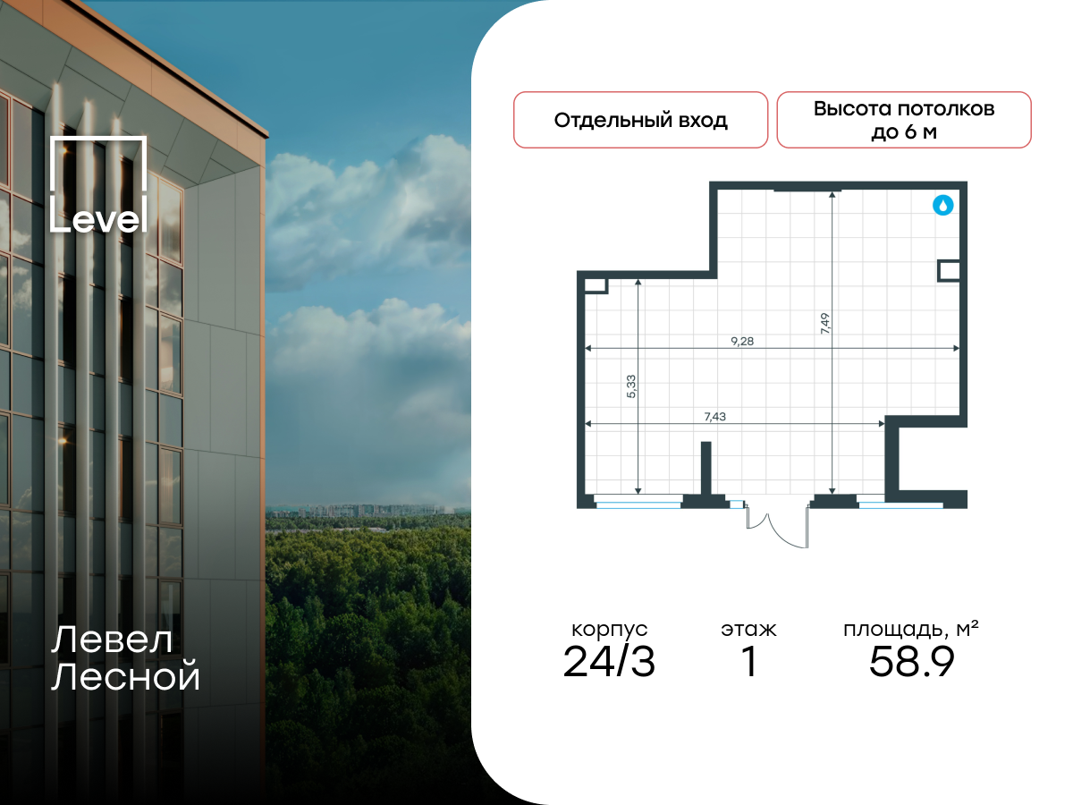 Продаётся коммерческое помещение свободного назначения площадью 58.90 м² в корпусе 1 дома 26 строящегося жилого комплекса комфорт-класса Левел Лесной. Сдача дома 26 запланирована на III квартал 2027 г. Проект расположен в зелёной зоне ближайшего Подмосковья, посёлке Отрадное. Развитая инфраструктура и уже заселённые корпуса делают этот проект перспективным для бизнеса.